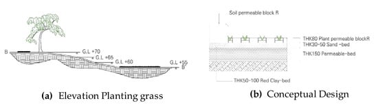 Green area concept: (a) Sectional elevation of the effects of planting trees and grass; (b) Conceptual design of the planting block.