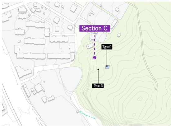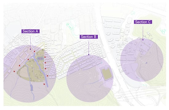 The design of the lower part of the mountain area was established by considering the convenience and value to the residents, as it was not considered beneficial to install large-scale facilities directly adjacent to residential areas. Some examples are shown in Figure 11. Detailed technologies are proposed for the sections marked A, B and C in the figure, each with its own characteristics and challenges that must be addressed.