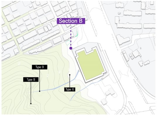 Figure 12 shows a schematic diagram of the technology that will be placed in the A catchment near the residential area. Because the lower catchment is very close to the living area, technologies need to be deployed that provide adequate protection for residents while avoiding the use of large-scale facilities. Given the objective listed for Type 5 facilities, it is proposed that parking lots near apartments located at the bottom of the mountainous area be used as storage, while Type 6 facilities will be installed to create a buffer space between the living area and the areas that are vulnerable to landslides. This could do double duty by also acting as an open green space that acts to reduce soil runoff. Type 7 Gabion-type sitting walls are proposed and will be positioned along the side of the stream to reduce the likelihood of the stream overflowing into inhabited areas.