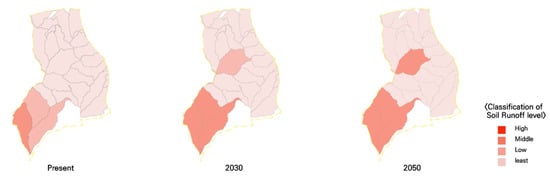 Figure 7 shows the predicted amount of soil runoff from the present to the year 2100 for the RCP 8.5 scenario, showing a generally increasing trend but with a peak suggesting that the risk of disaster will increase most rapidly in the decade from 2051 to 2060 in Namhyeun-dong. The analysis predicted that approximately 1210.6 of soil will runoff in a single 24 h period and 1808.8 over the course of each year from 2051 to 2060, which is approximately 598.2 more than the current amounts, when other external factors are excluded.