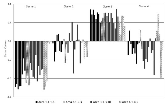 Figure 3 indicates how well the discriminant functions were able to separate the different clusters. The discriminant functions were linear combinations of the area variables; thus, Figure 3 provides an indirect answer to the question about the effectiveness of the cluster solution. Figure 3 uses only two of the three discriminant functions; however, those two functions accounted for most of the explained variance (94.2%). From the plot in Figure 3, it is apparent that the different observations were quite well separated, with limited overlap between the cluster boundaries. Cross-validation of correctly classified cases based on the derived discriminant function produced promising results. The total proportion of correctly classified cases was 76.2%; in particular, cluster 3 (87.5%) and cluster 1 (75%) were well identified. With the other two clusters, which had less strong profiles, identification was more difficult: 66.7% of cases were correctly assigned in both cases.