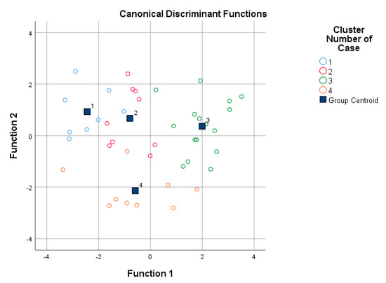 The first discriminant function (Equation (1)) had an eigenvalue of 3.160 and explained 64.9% of the variance. The second function (Equation (2)) had an eigenvalue of 1.429 with an explained variance of 29.3%. The third function (Equation (3)) had an eigenvalue of 0.281 and explained variance of 5.8%. Wilks’ lambda suggested that all three linear combinations of predictor variables were significantly different among the clusters. However, it was clear from the canonical correlation that Equations (1) and (2) were highly correlated with the clusters (Table 5).
