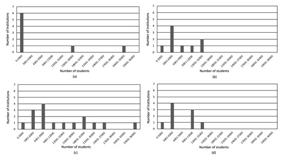 Distribution of number of institutions in each cluster according to size: (a) cluster 1 (lagging behind); (b) cluster 2 (asset driven); (c) cluster 3 (top of the class); and (d) cluster 4 (networkers). A small institution had up to 12,000 students; a medium-sized institution had 12,000–24,000 students; a large institution had over 24,000 students.