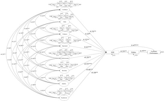 Table 1 shows the descriptive statistics and correlations between the variables of the object of study. Pearson’s correlations indicate that those emotions that have the same valence show a positive correlation, while those with a different valence have a negative correlation. Furthermore, positive emotions correlate positively with motivation (SDI), habits and academic performance. In contrast, negative emotions correlate negatively with motivation (SDI), habits and academic performance. Finally, habits are positively correlated with academic performance in both quarters.