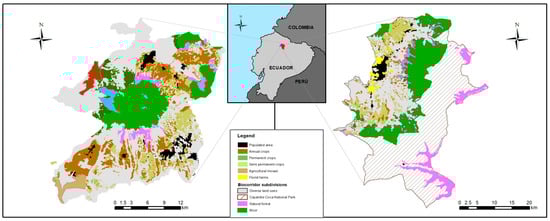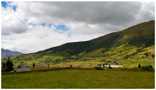 The “Biocorridors for Living Well” program in Ecuador was established to promote interventions related to soil and water conservation, with local people at the focal point of the program [30]. Protected areas such as forests, mangroves, and moors form the different ecosystems found in these biocorridors. As well as providing local species richness to land, moors act as a water sponge (located at an altitude of 3200–4700 m above sea level), generating ecosystem services for the local population, such as irrigation and drinking water [31] (Figure 1).