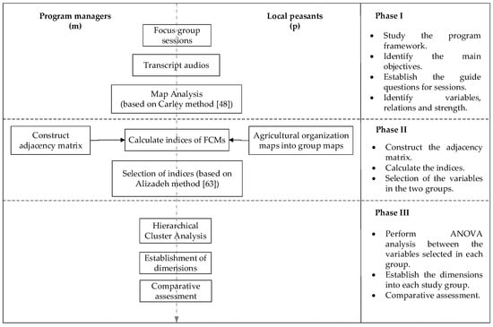 The study had three stages, as shown in Figure 3. First, a participatory approach was conducted through focus group sessions with different stakeholders. Second, map analysis and FCM construction were used to identify the key variables and causal relationships in the program intervention. Finally, hierarchical cluster analysis (HCA) using Ward’s linkage criteria was performed to assess and compare program managers’ and peasants’ perceptions on the “Biocorridors for Living Well” program.