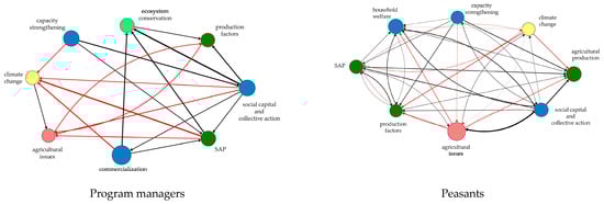 Figure 5 illustrates the connections between the eight most central variables in the managers’ and the peasants’ maps. The most central variable for both groups was social capital and collective action, understood as trust and teamwork [68]. As indicated by both groups, this variable is highly connected to other variables, and is considered a key element in reaching the conservation goals of the program [69]. Indeed, farmers emphasized the importance of this variable during the focus group sessions: “…if the organization among us was good, we could improve production planning, commercialization, and our well-being.”