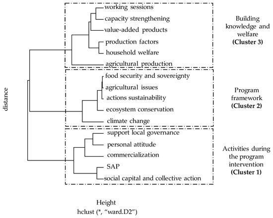 The HCA results are shown in the dendogram in Figure 6. Three clusters were obtained. Cluster 1 was denominated “activities during the program intervention,” considering the core activities explained in the program reports. Cluster 2, “program framework,” containing the objectives pursued by the program. Finally, Cluster 3, “building knowledge and welfare,” characterized by social strategies during the program intervention.