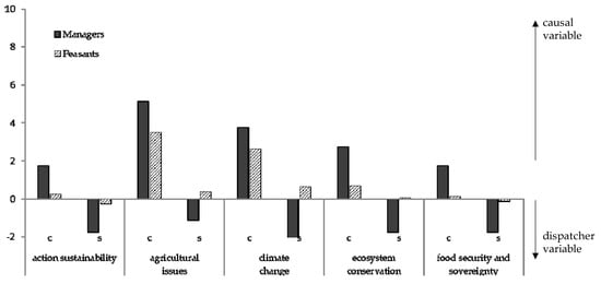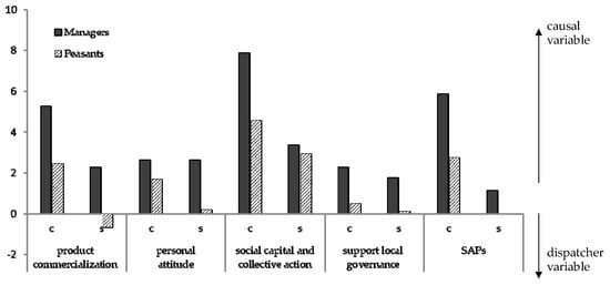 The profile of Cluster 1 (Figure 8) indicates a close agreement between managers and peasants on the "personal attitude" variable regarding the level of importance. Also, both groups considered personal attitude as a causal variable, that is, one that influences participation in the program [80]. Although peasants emphasized the importance of this variable during the focus group sessions, the results show a low score impact of this variable in the whole system. These findings indicate that not all of the participants felt motivated during the development of the activities. On the other hand, as described earlier in Section 2.2.2, both groups considered the “social capital and collective action” variable an important causal force for enhancing the biological biodiversity on farms in the program [67,81].