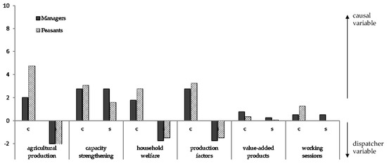 According to the resultant sign of sim and sip, the variables were explained. For example, a positive sign belongs to a cause group, and a negative sign belongs to the effect variable [63]. Then, differences between the variables c and s were taken. This difference is between program managers and peasants. Equations (7) and (8) show the formulas applied: