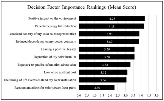 This study examined solar technology adoption at the residential scale by conducting an online survey that forced respondents to rank decision factors that motivated their choice to adopt. The most important decision factor was positive impact on the environment, with a mean importance score of 4.25. This was followed by expectation of lower energy bills, one of the two economic factors, which was rated as almost equally important to environmental considerations. This finding confirms findings from previous research on solar technology adoption at the residential scale [24] that adopters are motivated by both environmental and economic considerations; therefore, framing solar energy technology based on an exclusive focus on either the environmental or the economic benefits creates an artificially narrow focus that does not align with actual adoption motivations, which recognize both economic and environmental benefits as important.