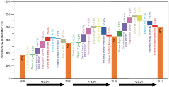 As one of the economic centers and the most urbanized areas in China, Jing-Jin-Ji urban agglomeration experienced a dramatic increase of 120% (Table A1) in the district heating energy consumption of the building sector (DHEB) from 2004 to 2016 due to the rapid urbanization in population and building area (Table A2). Moreover, the Jing-Jin-Ji urban agglomeration is challenged by severe air pollution, especially in winter, when the pollution is caused by huge heating fuel combustion [3]. To address this problem, the Ministry of Environmental Protection launched the “Issuance of the Action Plan for the Control of Air Pollution” [4] and a series of actions that aimed to curb air pollution in the Jing-Jin-Ji urban agglomeration [5]. Efforts have vigorously been made to promote clean energy generation and efficiency heating systems in the Jing-Jin-Ji urban agglomeration [6], and their effectiveness has been proved [7]. Thus, it is necessary to quantitatively evaluate the influential drivers and sustainable development process of the DHEB in the Jing-Jin-Ji urban agglomeration, as this information is crucial for understanding the management of energy conservation and emissions reduction, as well as the influence of urbanization and mitigation policy.