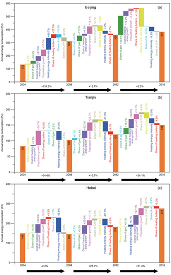 Figure 1 illustrates the decomposition results for the changes in the DHEB in the Jing-Jin-Ji urban agglomeration from 2004 to 2016. The total DHEB of the Jing-Jin-Ji urban agglomeration experienced significant growth of 120% from 2004 to 2016, and it reached 52.3%, 18.3% and 22.0% during 2004–2008, 2008–2012 and 2012–2016, respectively. An increasing trend was also found in each subregion in 2004–2016, with growth rates of 184%, 80% and 85% in Beijing, Tianjin and Hebei, respectively (Figure 2). These increases reflect rapid development of district energy systems during urbanization in the Jing-Jin-Ji urban agglomeration in the past decade.