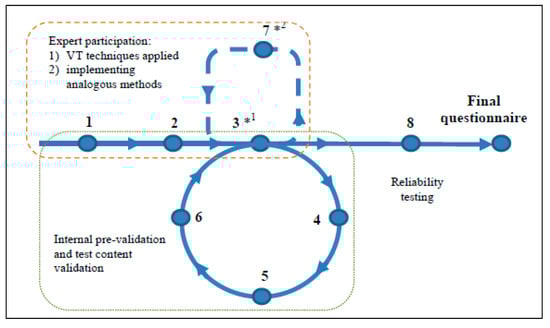 Questionnaire design. Notes: *1 Internal pre-validation (stages 1–6) and the pilot test (stage 7), in conjunction with the participation of outside experts (stages 1, 2, 3, and 7), led to an abridgement of the questionnaires and a redefinition of their content. *2 As the stage 3–6 loop had to be repeated once in the first round of telephone interviews for the initial and final surveys, a second round was required in both. In contrast, the questionnaire on the appraisal of classmates’ exercises called for only a single round of interviews, indicating that the results were apt for direct processing. The final design of that questionnaire was based on the five-point Likert scale routinely used in online surveys and deemed here to preclude bias in the measures of central tendency and the presence of logical error, according to the results of the aforementioned interviews.