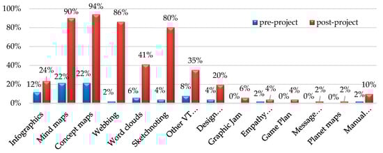Prior to participation in the project, 64.71% of the students claimed to be unaware of visual tools or their application for professional or academic purposes, corroborating the initial hypothesis. That, together with the growing applicability of such tools in the business world, led to the choice of these VT techniques for the project at hand. According to the pre- and post-project awareness of the most common visual techniques, depicted in Figure 2, participants focused on the most useful techniques, disregarding others.