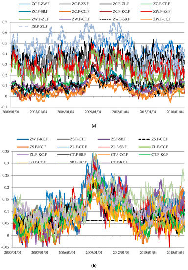 (a) Estimates of dynamic Kendall’s tau coefficients for dependencies between rates of return from futures for agricultural commodities. (b) Estimates of dynamic Kendall’s tau coefficients for dependencies between rates of return from futures for agricultural commodities.