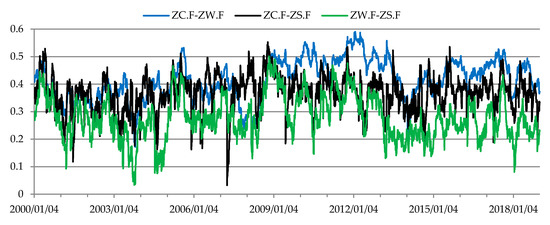 The structure of conditional dependencies in commodity futures markets varied between 2000 and 2018, as confirmed by the different states of markets identified (Figure 6, Figure 7, Figure 8, Figure 9 and Figure 10, Table 3, Table 4, Table 5, Table 6 and Table 7). In the period from late 2007 to early 2013 marked by the global economic and financial crisis (the 2007–2009 subprime crisis, the 2008–early 2013 European debt crisis), changes in the structure of these dependencies were particularly noticeable in the markets for commodity futures, in which rates of return on quoted prices were generally weakly correlated (soft commodities; agricultural commodities other than grains and oilseeds). As regards futures contracts for agricultural commodities, the strongest dependence between the rates of return was recorded for soybeans and soybean oil futures (Figure 1, Table 3). Soybeans are used in the production of many foods because of their high protein content, with approximately 2/3 of produced soybeans being processed into soybean oil and soybean meal. In turn, soybean oil is used to produce cooking oils, margarine, mayonnaise and salad dressings, in the chemical industry and in biodiesel production [88]. An increase in dependencies between soybeans and soybean oil futures contracts was observed in 2004, with stronger relationships recorded over the next nine years. One of the reasons for the increased dependencies may have been connected with the development of the biofuel market. The requirement to add ethanol to fuels was introduced in 2001 by the European Union and in 2005 by the U.S. Congress [89]. Two states of market were identified in the agricultural commodity futures market (Figure 6, Table 3). The correlation between the rates of return on futures prices in the agricultural commodity market became stronger in early 2008 and remained at a similar level until mid-October, 2012. In approximately the same period stronger dependencies were also recorded in the futures market for soft commodities, where two states of the market were also identified (Figure 7, Table 4).