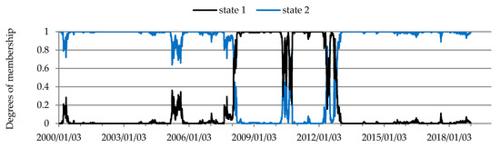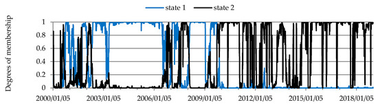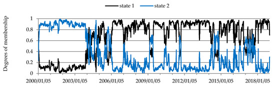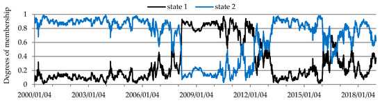 This paper is a continuation of the authors’ previous research [52]. The authors propose the application of fuzzy clustering methods to identify changes in the structure of conditional dependencies, market states in different commodity futures markets in the period 2000–2018, and to determine the time of transition from one state to another. This is a long-term study as the authors intend to identify the patterns of the conditional dependence structure and their changes in selected large and liquid markets in different sub-periods (stability and crises).