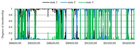 where: T—number of moments in time (days); ()—number of fuzzy clusters; K—number of variables; m—parameter used to adjust the degree of fuzziness for the clustering process; − a matrix of membership degrees of the objects in fuzzy clusters; − a matrix of cluster centroids; − a data matrix, with representing the normalized value of variable k in object t.