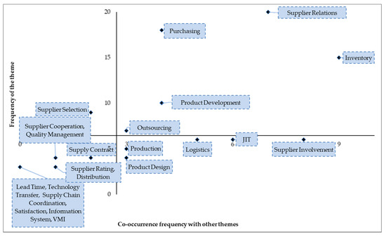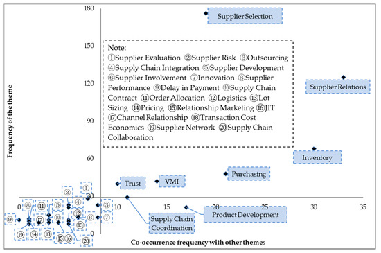 - Researchers have always been very enthusiastic about the research themes, such as “supplier selection”, “supplier relations” and “inventory”, which are always in the first quadrant of the quadrant diagrams for the four stages, see Figure 2, Figure 3, Figure 4 and Figure 5. This conclusion can also be confirmed in Table 4, from which it can be found that the frequency of these three themes has been always in the top three.