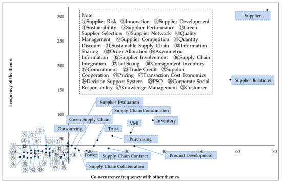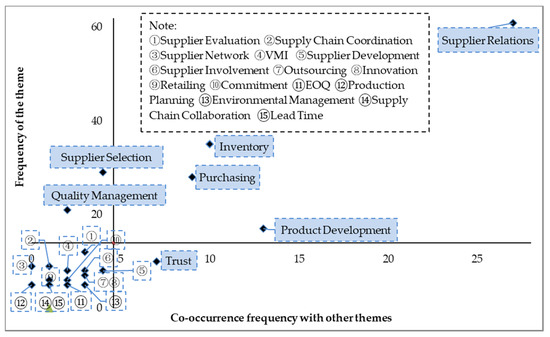 - It can be predicted from the trends that research themes, such as “green supply chain”, “supply chain collaboration”, will become more and more important in the field of supplier management. “Supply chain collaboration” appears in the word database at stage 3, and “green supply chain” appears in the word database at stage 4. It can be found in Figure 5 that they are all in the fourth quadrant and are very close to the first quadrant. According to the calculation results in Table 4, the self-frequency and co-occurrence frequency of these two themes are of great potential, and it can be predicted that they will likely move to the first quadrant in the future.
