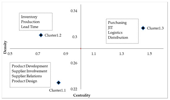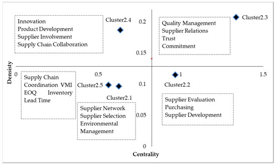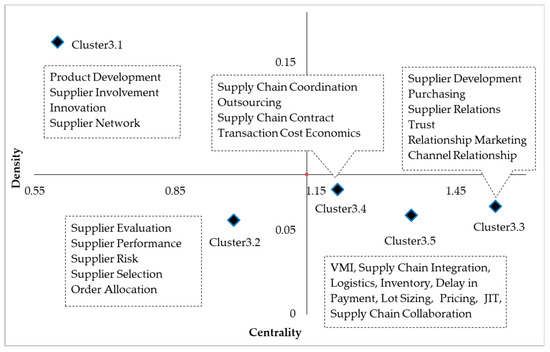 - As can be seen from the strategic diagram for stage 4 (Figure 13), the “supplier relations” cluster (cluster 4.6), is in the first quadrant, indicating its high strategic importance in the field of supplier management. In addition, from the comparative analysis of theme clusters for the four stages, it can be found that the centrality of “supplier relations” cluster at different stage is always high, which indicates that “supplier relations” clusters have always been playing a significant role in the field of supplier management. These results are consistent with the results of co-word analysis, which show that the self-frequency and co-occurrence frequency of theme members in the “supplier relations” cluster is always high, and present a rapid growth trend during the research period.