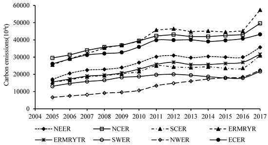 In terms of the change range, the growth rates of carbon emissions varied between economic regions. In all regions, the largest increase occurred in the NWER, in which carbon emissions rose from 66.25 million tons in 2005 to 223.83 million tons in 2017, with a mean annual increment of 18.30%. This implied that the emissions reduction in this region did not seem to be effective during the research period. The next were the ERMRYR, the NEER, the ERMRYTR, and the SCER, with an average annual increase of 9.60%, 8.34%, 7.96%, and 7.77%, respectively, whereas the increase in carbon emissions of the NCER, the SWER, and the ECER were very close and showed a relatively low level, with a mean annual increase of 5.23%, 5.06%, and 5.04%, respectively. In consideration of the heterogeneity of China’s regional carbon emissions, we must consider this disparity and its influencing factors in future emission reduction measures.