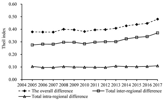 From the perspective of the source of the overall difference, the inter-regional difference in carbon emissions varied from 0.275 in 2005 to 0.371 in 2017, which was far higher than the corresponding intra-regional differences. However, this was contrary to the results obtained by Yang and Liu [14], who observed that the intra-regional difference of carbon emissions was far greater than the inter-regional differences. That may be attributed to the too large research unit, because Zhao’s research was based on the three regions of East, middle and West China. Moreover, the variation trend of inter-regional difference was almost similar to that of the overall difference from 2005 to 2017 (Figure 2). This result indicated that the overall difference was mainly caused by the inter-regional difference, which could be confirmed by the contributions of inter-regional and intra-regional differences. We found that the contribution of inter-regional differences showed a slightly increasing trend, whereas that of intra-regional inequality indicated a downtrend (Table 2). For instance, the contribution rates of inter-regional differences to the overall difference based on the Theil index were 72.55% in 2005 and 77.20% in 2017. The contribution rate of intra-regional difference to the overall difference in 2005 was 27.45%, falling to 22.80% in 2017. This showed that the contribution of inter-regional difference only had a slight increase during the research period, but future policy making and implementation should consider balancing inter-regional differences in carbon emissions.