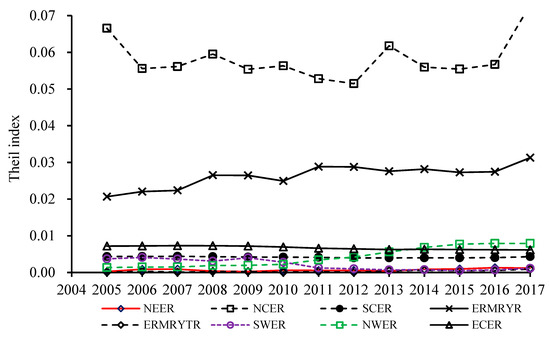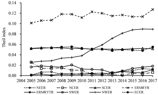 For the inter-regional difference, it appeared that the Theil index was distinctly different, and showed the differentiation trend for various regions. As demonstrated in Figure 3, during the entire study period (2005–2017), the ERMRYR had the largest Theil index with a mean value of 0.115, followed by the NWER, SCER, and ECER, while the ERMRYTR showed the smallest inter-regional difference based on the Theil index, with a mean of 0.004. Except for an obvious uptrend of Theil index in the ERMRYR and NWER, other economic regions only presented marginal fluctuations in Theil index. These results demonstrated that the ERMRYR was the largest contributor in total inter-regional differences increase, followed by the NWER, SCER and ECER (Table 2). Compared with the inter-regional difference, the intra-regional difference based on the Theil index remained basically unchanged except for a slight rise (Figure 2), but the intra-regional difference in various economic regions showed a trend of differentiation in 2005–2017. From Figure 4, it is obvious that the NCER had the largest intra-regional difference with an average of 0.058 and a frequent fluctuation, followed by the ERMRYR, whose intra-regional difference witnessed a fluctuating upward trend, with a mean value of 0.025; while the other six economic regions only showed smaller intra-regional difference indexes, all of which were less than 0.01. This indicated that the NCER and ERMRYR were the largest two contributors in total intra-regional difference increase. However, the contribution of total intra-regional difference to the overall difference of carbon emissions was relatively small (Table 2).