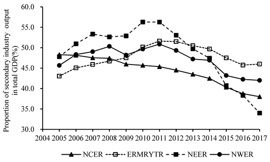As far as the industrial structure was concerned, although the average of the elastic coefficients of the ratio of the second industry to GDP was the smallest, it was all positive in each economic region, which was consistent with the expectation that the increase of the proportion of the second industry will promote the growth of carbon emissions. However, from Table 5, the effect of industrial structure on energy-related carbon emission was quite different in various economic regions, and the elastic coefficients changed from 0.014 to 0.751, indicating that the industrial structure was also the contributor to regional carbon emission difference. The regions with great influence of industrial structure on carbon emission in order were the NCER, ERMRYTR, and ECER, and the VIP values of industrial structure in the NCER and ERMRYTR were close to 1.0, indicating that the industrial structure still had a strong ability to explain carbon emission in these two regions. It also means to further optimize the industrial structure and reduce the proportion of the secondary industry in the above regions, which is conducive to carbon emission mitigation. The regions with less impact of industrial structure on carbon emissions were the NWER and NEER, with the elastic coefficients of 0.014 and 0.022, respectively, and the VIP value of the NEER was less than 0.8 (Table 6), showing that the positive effect of industrial structure on carbon emissions was weak in these two regions. The results above also further indicated that the carbon emissions in the NCER and ERMRYTR were more easily affected by the industrial structure than those in the NWER and NEER, which may be related to the dependence of regional economic growth on the pull of the secondary industry [27]. For the developed NCER and ERMRYTR, although the industrial allocation has improved and the energy consumption of GDP has constantly reduced, the industrial structure is still relatively traditional. In addition, economic growth relies mainly on the energy-consuming secondary industry with high input-output efficiency. As the carbon emission of the secondary industry is far greater than that of the first and third industries, the regional carbon emission was related closely with the proportion of the secondary industry. This can be verified by the changing trend of the output proportion of the secondary industry to the GDP in the ERMRYTR (Figure 5). As for the share of secondary industry’s output in the GDP of the NCER, there was a significant downward trend. That may be caused by the decline of the proportion of the secondary industry in the Beijing-Tianjin area due to industrial structure optimization and upgrading and “capital function relief” (since 2014, the coordinated development of Beijing-Tianjin-Hebei region has become a national strategy, the industries with energy-intensive consumption and high pollution were shut down or transferred to the surrounding areas, and the proportion of secondary industry in Beijing decreased to 19.0% in 2017), which partially counteracted the influence of the large proportion of the secondary industry in Shandong and Hebei provinces and caused a significantly decline in the share of the output value of the secondary industry in the whole NCER. However, this does not mean that the carbon emission in the NCER was not significantly affected by the share of the secondary industry. The reason is that in the NCER, Shandong and Hebei are resource-intensive provinces. The economic development impelled the pillar industries such as chemical, metallurgy, building materials, machinery and automobile to consume large amounts of high-carbon fossil energy and produce a lot of carbon emissions, causing the elastic coefficient of the share of the secondary industry affecting carbon emissions reached 0.751 in this region (Table 5). This indicated that the development of the secondary industry in the NCER has reached a stage of serious diseconomy. Taking Shandong Province in the NCER as an example, its GDP increased from 1836.7 billion yuan in 2005 to 6300.2 billion yuan in 2017 (ranking the third in China), with an annual average growth of 24.3%, but its economic development was dominated by the secondary industry at the expense of energy resources. According to our calculation, the output value of the secondary industry accounted for over 52.0% of the provincial GDP during 2005–2017, which resulted in a large number of high carbon energy consumption, and thus carbon emissions. For example, the carbon emissions caused by coal consumption increased from 580 million tons in 2005 to 910 million tons in 2017, with an average annual growth of 5.2%. The NEER and NWER belong to underdeveloped areas. Although the proportion of resource-based cities and industries is relatively high, the industrial structure adjustment is vulnerable to the impact of macroeconomic policies. As a result, the proportion of the secondary industry output in total GDP changed in an “M” pattern (Figure 5). Moreover, the NWER had undertaken a large number of industries from the developed eastern region, which ultimately restrained the carbon emissions increase to a certain degree, resulting in a weak positive impact of the secondary industry’s share on the regional carbon emissions (Table 5, Table 6). This shows that the moderate transfer of the secondary industry to these regions may reduce national total carbon emissions.