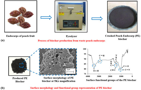 Illustration of Peach Endocarp (PE) biochar: (a) Production conditions and (b) surface properties.