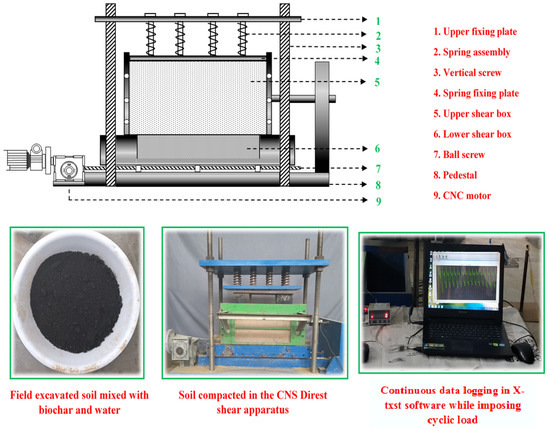 The dry soil was mixed with PE biochar at three different amendment rates (5%, 10%, and 15%) in weight to weight composition. The amended soils were characterized for its basic geotechnical properties and the respective results are listed in Table 2. Monotonic direct shear tests were conducted for the un-amended bare soil and the BAS at the compaction state of 0.9 MDD, where the test results could also be considered as a verification index for the designed constant stiffness direct shear apparatus. The monotonic direct shear test was carried out at a shear rate of 2 mm/min and normal load of 40 kN/mm2. Furthermore, the bare soil and BAS were subjected to cyclic loading at the similar compaction state using the designed constant stiffness direct shear apparatus. The pictorial representation and the sample preparation for cyclic loading are picturized in Figure 2. The shear rate and normal load in the case of cyclic loading was kept at a rate of 5 mm/min and 40 kN/mm2 respectively.