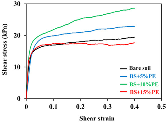 Despite the positive result at the first two cases, there is a contrasting trend in BS+15% PE, where the peak shear stress value is slightly decreased with respect to the bare soil. This peak value reduction could be ascribed to the formation of clay-carbon complexes at higher amendment rates [54]. The formation of clay-carbon complex was also observed in previous studies, where this complex reduces the interlocking mechanism between the biochar and soil grains [55]. In terms of numerical expressions, the peak shear stress value was increased with respect to the bare soil by 30% and 45% for BS+5% PE and BS+10% PE respectively. For BS+15% PE, the peak shear stress value was decreased to 8% with respect to the bare soil.