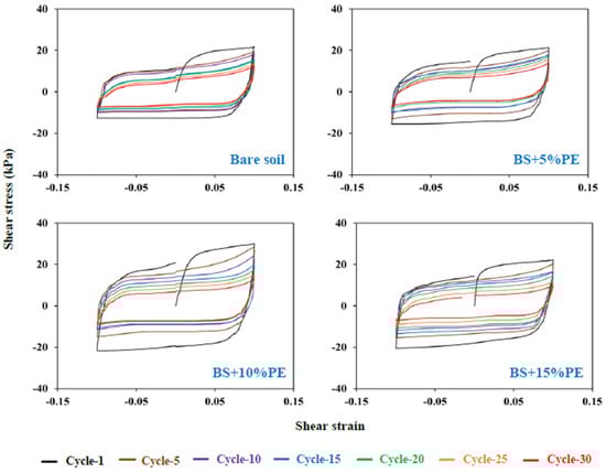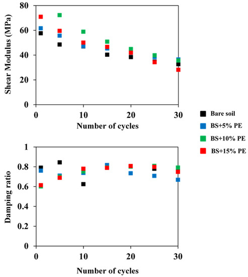 In order to compare the loading behavior between bare and BAS precisely, shear modulus and damping ratio values were computed and plotted against a number of cycles of loading (Figure 6). From the figure, it could be seen that there is a decrease in shear modulus of all soil types with an increase in the number of cycles. This reduction in shear modulus is evident due to an increase in the pore water pressure of compacted soil under cyclic loading [56]. Whilst, when comparing the results between the individual soil types, the shear modulus for all BAS increased with respect to the bare soil. This increment could be seen only in the first 15 cycles, later the modulus values were almost similar with the bare soil. On the other hand, there was not a significant change in the damping ratio, when the soil samples were compared.