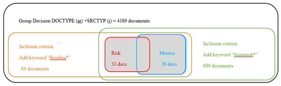 Keyword selection has been done in the second step. First the important keywords are listed. The list includes a representative index of the main objectives. These keywords are group decision, method, resilience, sustainability, risk and metrics. The second step is implementing trial searches in Scopus while only limiting the search scope by keywords, sorting the results list according to relevance and checking the keywords in the first 100 papers to find the similar keywords that are used in scientific papers for the same context. The search query for Scopus advance search is as follows:
