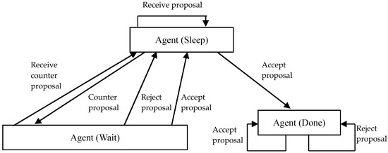 The state of agents is defined as State = {Sleep, Wait, Done}, where the Sleep indicates the initial state of the agents and when waiting for other agents to send participation proposals; the Wait indicates that the agent has sent a participation proposal to another agent and wait for its response; the Done indicates that the agent has accepted a participation proposal and the participation negotiation has been completed.