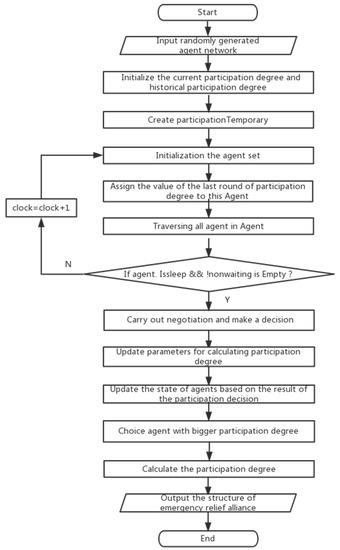 This paper will address these questions. The remainder of this paper is structured as follows. In Section 2, we review relevant literature and identify the research gap that this paper focuses on. In Section 3, we give a formal expression based on a multi-agent system negotiation interval, the participation decision function is presented, and the interaction process of the participants is analyzed. Section 4 gives the formal definition of the participation degree and participation strategy function, and an algorithm for constructing an emergency relief alliance is proposed. In Section 5, we compare our approach and the competing algorithms and summarize our results. Conclusions and an outlook on future research directions are given in Section 6.