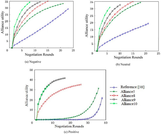 In Reference [38], the parameter is assigned in advance and cannot change in the negotiation process, and the concession extent is relatively fixed. The ability of negotiation participants cannot be fully reflected in Reference [38], while the parameter is not assigned in advance in our proposed method. Once each alliance is formed, the negotiation data will be saved. The alliance formed in the next round will use this series of data to calculate the agent’s participation degree, followed by the dynamic assignment of according to the value. This participation strategy based on participation degree fully reflects the difference in negotiation ability and negotiation situation.