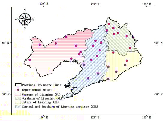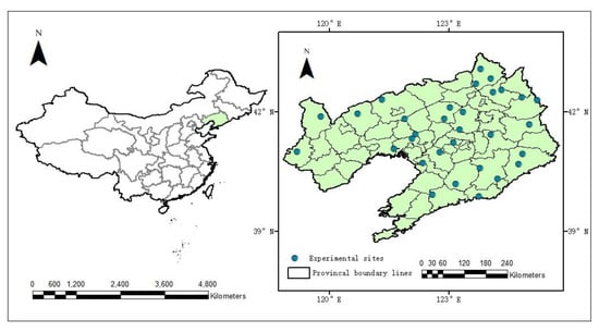 Spatial distribution of the 31 experimental sites for maize in Liaoning province of China.