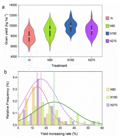 The maize grain yields at different N fertilization levels (-N, N90, N180, and N270) for all sites is shown in Figure 2a. The mean grain yields of the -N, N90, N180, and N270 treatments were 7932.7 kg ha −1 (ranged from 5565.3 to 10,266 kg ha −1), 8998.9 kg ha −1 (ranged from 6214.5 to 11,250.2 kg ha −1), 9885.8 kg ha−1 (ranged from 8137.5 to 12074.7 kg ha −1), and 9150.3 kg ha −1 (ranged from 7149.3 to 11,915.3 kg ha −1), respectively (Figure 2a). The frequency distribution of the yield increase rate was shown in Figure 2b. Particularly in the N180 treatment, the yield increase rate was the highest, which ranged from 4.77% to 58.38%, with an average of 25.89%. Results showed that the mean yields increase rate in the N90 and N180 treatment was 13.74% and 16.15%, with the increasing range of 2.04–32.05% and 1.36%–51.67% (Figure 2b). It is remarkable that the grain yields in each treatment with receiving N fertilizer management from high to low was: N180 > N270 > N90 in all the regions (Figure 2a).