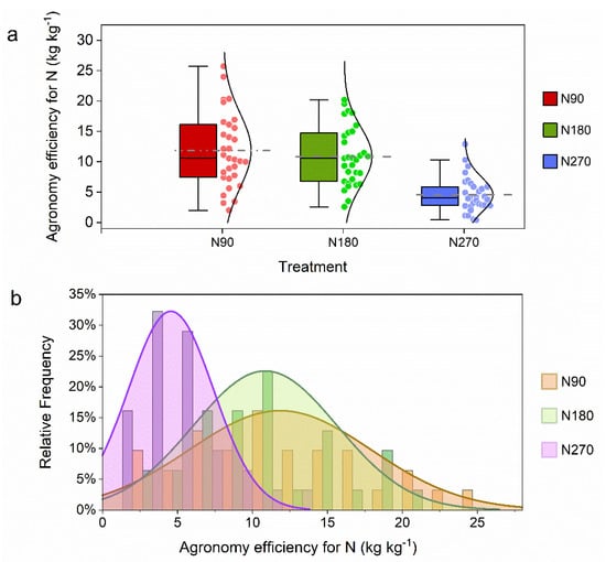 The frequency distribution of agronomic efficiency for N (AEN) on maize was shown in Figure 2. In these database, the agronomic efficiency for applied N on maize in N90, N180, N270 treatments was 11.8 kg kg −1 (ranged from 2.0 to 25.7 kg kg −1), 10.8 kg kg−1 (ranged from 2.6 to 20.2 kg kg −1), and 4.6 kg kg −1 (ranged from 0.4 to 2.9 kg kg −1), respectively (Figure 3a). The data of each treatments presented normal distribution curves (Figure 3a). From the relative frequency of AEN (Figure 3b), it could be seen that about 16.1%, 22.6%, 35.5%, 12.9%, and 12.9% of AEN samples in N90 treatment were distributed in the ranges of 0–5, 5–10, 10–15, 15–20, and 20–25 kg kg −1; approximately 6.5%, 29.0%, 35.5%, 19.4%, and 3.2% of AEN in N180 treatment were distributed in the ranges of 0–5, 5–10, 10–15, 15–20, and 20–25 kg kg −1; and 48.4%, 45.2%, and 6.5% of AEN in N270 treatment were distributed in the ranges of 0–5, 5–10, and 10–15 kg kg −1. Chuan et al. [29] reported that the AEN for wheat in China ranged between 0 and 35 kg kg −1, and AEN could an average value of 9.4 kg kg −1, and the results were similar with AEN in -N, N90, and N180 treatment of our study. The agronomic efficiency for N in our study was just at the baseline reported by Dobermann et al. [30] study, which illustrated that AEN for cereals in developing countries ranged from 10 to 30 kg kg −1. These results showed that agronomic efficiency of N remains low in China, emphasized to improve fertilizer management.