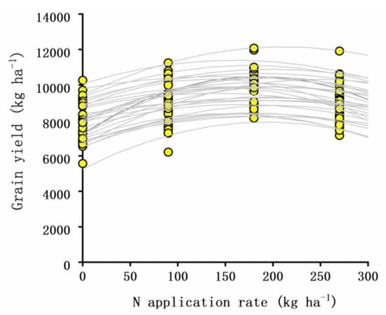 The quadratic model was used for fitted based on the grain yield and nitrogen fertilizer application rates (Figure 4). We made statistics on the regression coefficients for the quadratic model of nitrogen (N) fertilization effect on maize and obtained the following results in Table 1 and Figure 4. The mean values of coefficients a, b, and c in the quadratic model of nitrogen fertilizer effect in Liaoning Province are −0.056, 20.04, and 7859.8, respectively (Table 1). The average quadratic model of nitrogen fertilizer in Liaoning Province Y = −0.056N2 + 20.04N + 7859.8 was obtained.