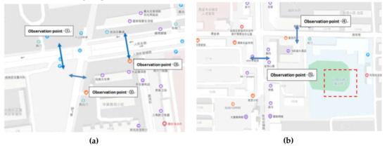 Number and location distribution of observation points. (a) Observation points of 1–3; (b) Observation points of 4–5.