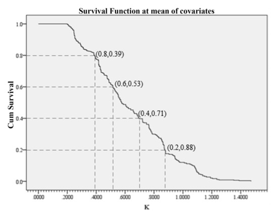 According to Figure 2, the corresponding relationship among the cumulative probability of survival, K value and risk perception score can be obtained in the case of the covariate means. The classification of risk perception sensitivity is shown in Table 11.