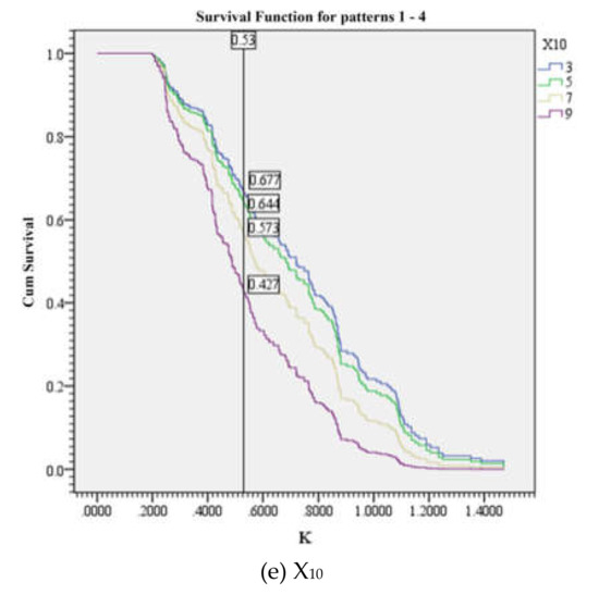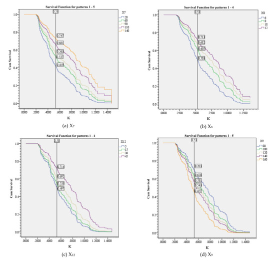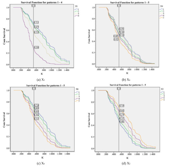 As shown in Figure 3a–c, the cumulative probability of survival decreased with an increase in the covariate value while maintaining the same K value. When the score of the personality characteristics (X1) factor increased from 1 to 4, the cumulative probability of survival decreased by 43.25%. When the score of the peer influence (X4) factor increased from 1 to 5, the cumulative probability of survival decreased by 13.9%. When the score of the riding behavior intention (X6) factor increased from 1 to 5, the cumulative probability of survival decreased by 20.9%. As the cumulative probability of survival decreases, the sensitivity of risk perception decreases, and the possibility of traffic conflict increases. Personality characteristics (X1) have the greatest correlation with the risk perception sensitivity. This analysis showed that the active and extroverted personality, negative peer influence and unsafe riding behavior intention of middle school cyclists have negative correlations with their risk perception sensitivity. The reasons are detailed as follows. (1) Middle school students are in a special stage of personality development, which is characterized as having poor self-control, along with being impulsive and aggressive. These students are not calm enough during the process of cycling, and their speed of cycling is relatively fast. In addition, due to their lively and active character, the cycling behaviors of middle school students are not standardized. (2) Most middle school students have a serious herd mentality [32]. The incorrect riding styles of friends will affect the riding behaviors of middle school students, especially running red signals, driving in the wrong direction and other violations of traffic rules. The more serious are the incorrect riding behaviors of friends, the lower is the risk perception sensitivity of middle school cyclists. (3) When cyclists are more prone to unsafe behaviors, their subjective risk perception sensitivity decreases, and unsafe riding behaviors such as chasing, arbitrarily changing lanes, and driving in the wrong direction often occur during cycling.