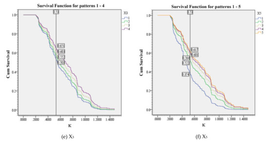 As shown in Figure 3d–f, the cumulative probability of survival increased with an increase in the covariate value while maintaining the same K value. When the score of the attitude towards traffic rules (X2) factor increased from 1 to 5, the cumulative probability of survival increased by 23.8%. When the score of the family education (X3) factor increased from 1 to 4, the cumulative probability of survival increased by 14.8%. When the score of the traffic safety awareness (X5) factor increased from 1 to 5, the cumulative probability of survival increased by 24.3%. As the cumulative survival rate increases, the sensitivity of risk perception increases, and the possibility of traffic conflict decreases. Cyclists’ traffic safety awareness (X5) has the greatest correlation with risk perception sensitivity. This analysis showed that positive attitude towards traffic rules, good family education and heightened traffic safety awareness of middle school cyclists have positive correlations with their risk perception sensitivity. The reasons are detailed as follows. (1) Being able to follow traffic safety-related reports via media, such as newspapers, television, and the Internet, seriously participating in traffic safety education activities organized by the school, regularly checking whether their vehicle performance is normal, and obeying traffic rules can help improve the risk perception sensitivity of middle school cyclists. (2) Family education, especially concerning parents’ riding behaviors, can deeply affect middle school students. Parents’ standard riding behaviors and correct riding concepts can improve the risk perception sensitivity of middle school cyclists. (3) The attitude of recognizing and following traffic rules can cultivate the awareness of risk perception of middle school cyclists and improve their sensitivity of risk perception.
