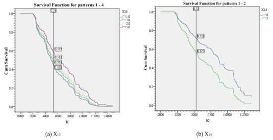 As shown in Table 10, X1 (personality characteristics), X4 (peer influence), X6 (riding behavior intention), X9 (non-motor vehicle flow), X10 (non-motor vehicle speed), and X14 (separation status of motor vehicle and non-motor vehicle) have negative correlations with the model; that is, as their values increase, the cumulative survival function decreases, the sensitivity of risk perception decreases, and the probability of conflict risk increases. X2 (attitude towards traffic rules), X3 (family education), X5 (traffic safety awareness), X7 (motor vehicle flow), X8 (motor vehicle speed), X12 (pedestrian flow), and X13 (non-motorized lane width) have positive correlations with the model, that is, as their values increase, the cumulative survival function increases, the sensitivity of risk perception increases, and the probability of conflict risk decreases. X11 (conflict type) is a categorical variable with three levels; the Wald test statistic is 1.362; and the p value is 0.714, which indicates that this variable does not have a correlation with the model and can be disregarded in the final analysis of risk perception.