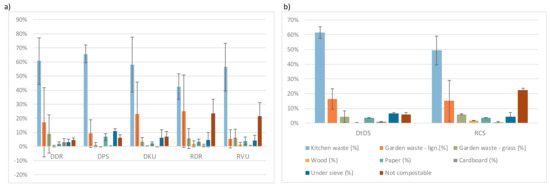 Picking analysis results for each of the 5 collection systems studied (a) and in aggregate form for DtDS and RCS (b). Averages are expressed as weight/weight percentage. Error bars represent standard deviation.