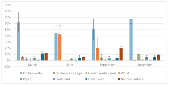 As far as the composition of the garden waste was concerned (Figure 2), it was observed that the percentage of lignocellulosic waste was greater in June (42.33% ± 14.15%) while the waste due to grass cutting was more present in December (10.51% ± 9.61%). It was observed that in the months with higher temperature (June and September) pruning greatly influenced (and reduced) the percentage of the kitchen waste and was clearly prevailing compared to the other fractions in the months with lower temperature (March and December).
