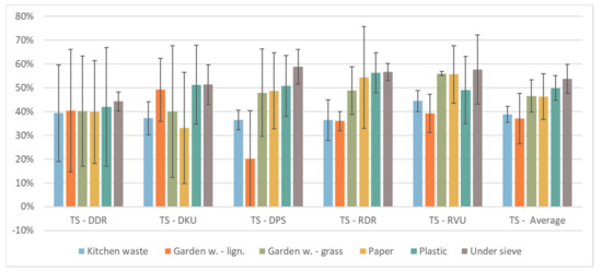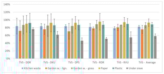 In terms of volatile matter, no trend depending on the collection system was present, as shown in Figure 4. On average the TVS of kitchen waste was 82% ± 2% while the TS of garden waste was 75% ± 4% for grass waste and 86% ± 2% for ligno-cellulosic waste due to pruning. The TS of paper and plastic were 93% ± 2% and 88% ± 2% respectively, while the under sieve had a dry matter content of 58% ± 12%.